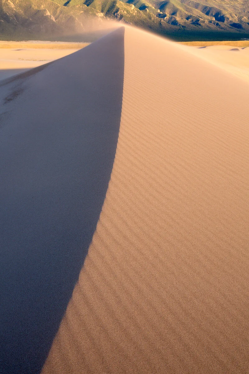 On the drive, I was telling myself to keep it easy. This was a scouting trip for a future workshop with a goal to find an easier route into the heart of the dunes. Something that didn’t start from the visitor center. Something that felt remote and untouched. I had some ideas in mind. When I saw the “Campground Full” sign, I turned into the next available pull-out to put together some thoughts. I have stopped here quite a few times in the past. It’s a popular scene with photographers even though I’d guesstimate the vast majority of folks fly by it to get to the official park entrance. I love the angle myself but have never bothered to shoot it. I’ve seen boatloads of fantastic images. But what bothers me is that it sits right next to the road. Not my cup of tea. Not my version of the wild. Not what comes to mind when I drove four hours to get away from it all. The last couple of times, I have had this inkling to simply start hiking in from there. Maybe find that alternative entrance point. So I did. A couple of hours before sunset, I got out and immediately started prepping myself to spend a night in the dunes. With the other nearby campgrounds not appealing to me for one reason or another, I packed enough food and water for a full day. I strapped on my sleeping bag. No tent. I was gonna scout around, enjoy the stars, and then hope to be conveniently in place for sunrise the next day.